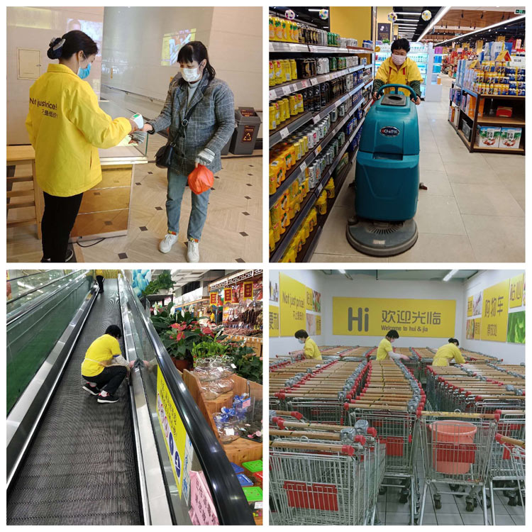 疫情期间,超市坚持执行严格防控管理,卖场人员必须佩戴口罩;购物车、购物篮、地面、电梯等每日定时全面消毒;严格要求进店顾客带口罩,测体温,遇到体温异常的顾客,及时上报有关部门。