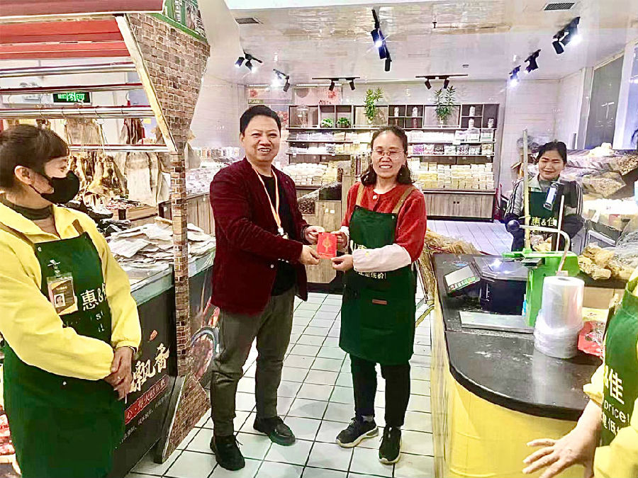 2023年11月29日,正值惠而佳超市销售高峰期,一位顾客在购物过程中将个人红包遗落在超市卖场走道上,干货主管张俊平发现后,急忙上报超市值班店长寻找失主。