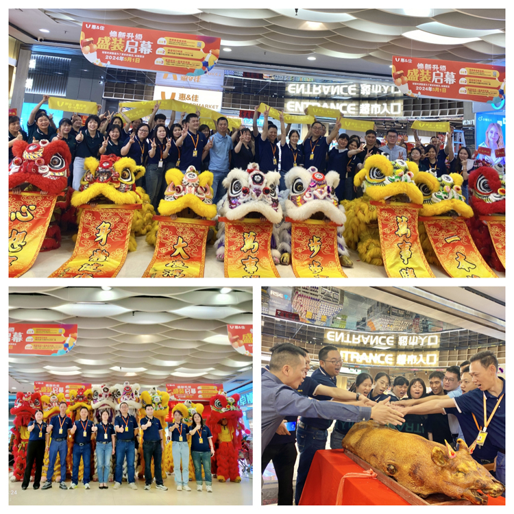 开业庆典当天,我司特意聘请到“黄飞鸿杯”世界华人狮王争霸赛的亚军舞狮队前来表演助兴,增添喜庆气氛。开业现场鼓乐齐鸣、载歌载舞、人声鼎沸,精彩的舞狮表演、招牌掀幕、切金猪以及剪彩仪式等精彩环节吸引了大批顾客朋友驻足围观,现场人气爆棚。店内水果区、蔬菜区等区域也挤满了前来购物的顾客,“一直在看惠而佳超市装修好了没有,今天终于恢复营业了,我们一大早就赶过来了!”一位住在一街之隔的顾客朋友说道。