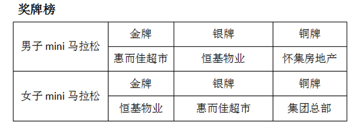 10月31日上午,腾业集团第十七届员工运动会-mini马拉松赛正式启动,比赛场地为怀集总部出发环绕翠湖半岛一圈,约5公里。参赛队伍分别有:集团总部、房地产、恒基物业、惠而佳超市和悦景康城物管中心。比赛吸引了众多市民围观,共决出16枚奖牌,截止目前累计产生奖牌53枚。