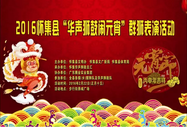 2016年怀集县“华声狮鼓闹元宵”群狮表演活动已圆满结束,感谢各醒狮队为我们带来精彩的演出!敬请关注下一次活动!