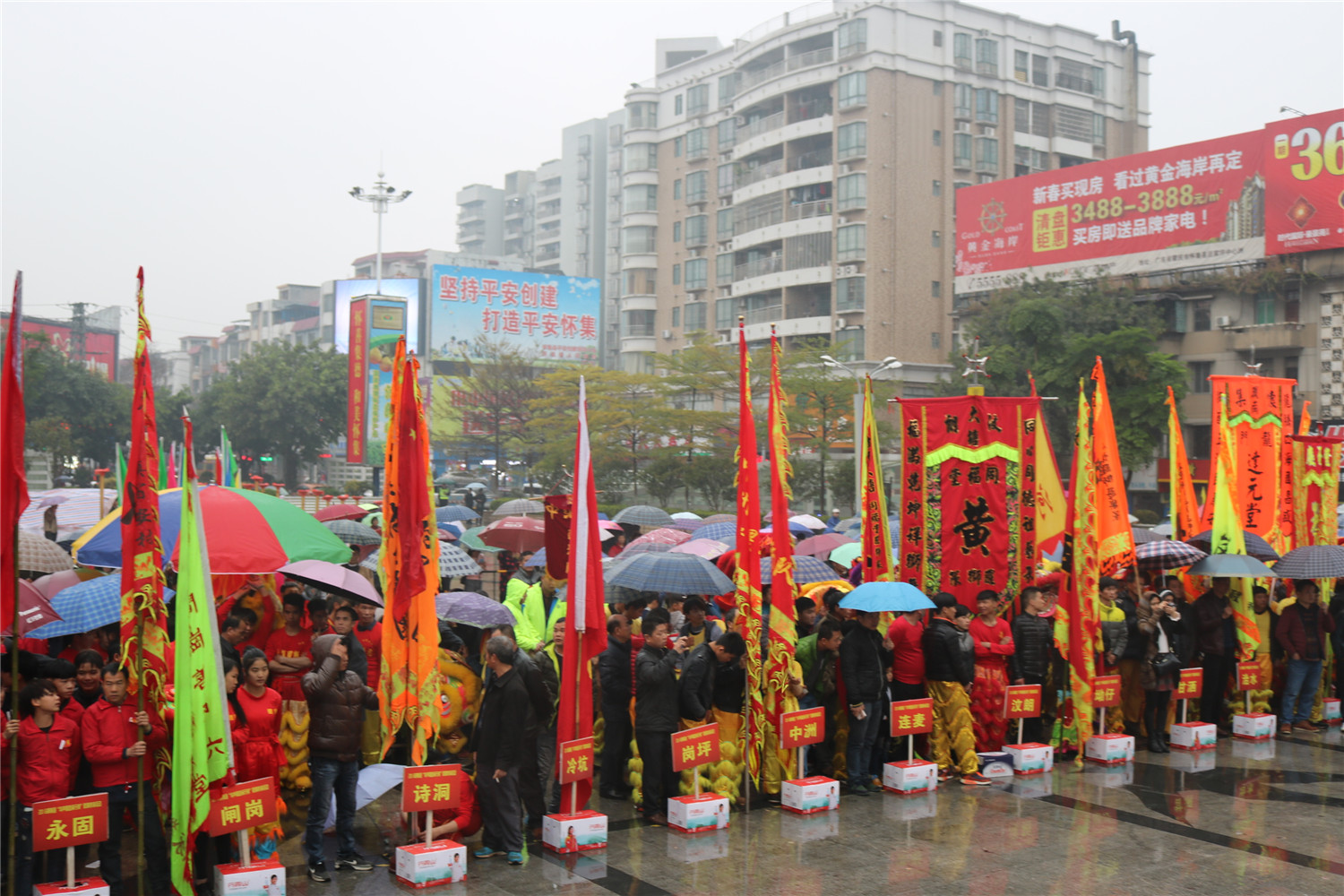 上午九点左右,各乡镇醒狮队陆续到场,锣鼓声喧天,尽管下雨,也吸引了不少群众,撑伞驻足观看!