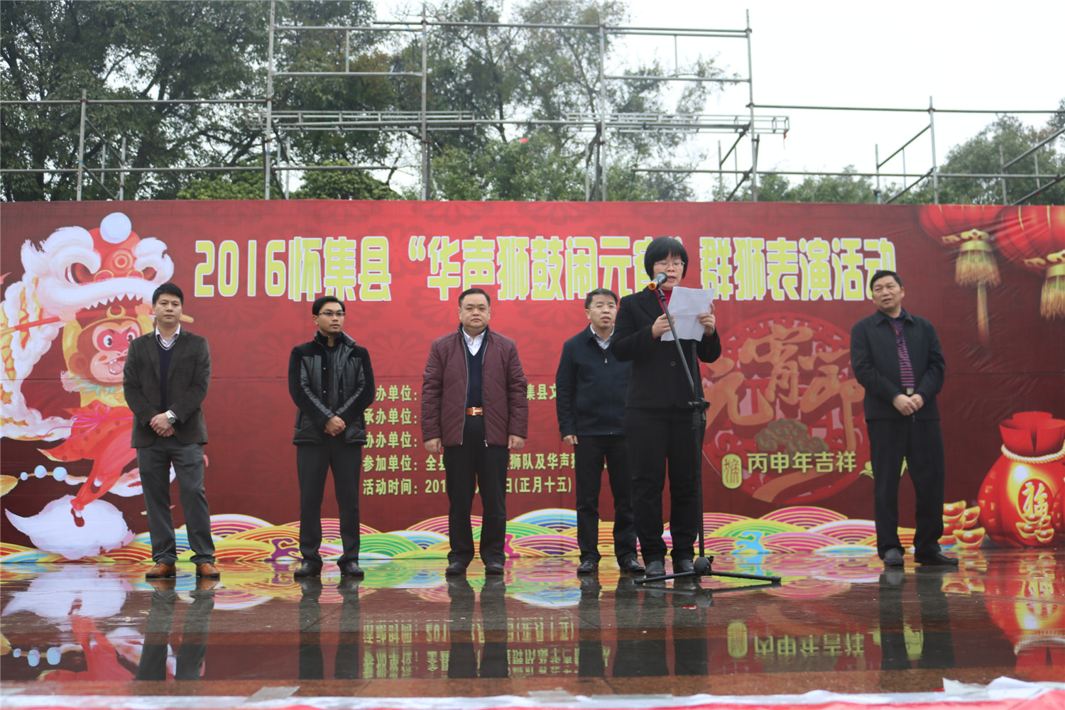出席本次活动的领导和嘉宾有:县常委、宣传部长黄红星同志,副县长文红妹同志,县宣传部副部长、县文明办主任邓志强同志,县宣传部副部长、县文广新局局长郭洪芳同志,县文广新局副局长、县体育局局长高加同志,广东腾业实业集团资产管理中心总经理梁铭枝先生,怀集华声狮鼓总汇负责人植才杰先生。怀集华声狮鼓总汇负责人植才杰先生、副县长文红妹同志分别在开幕式上致辞,由县常委、宣传部长黄红星同志宣布开幕。