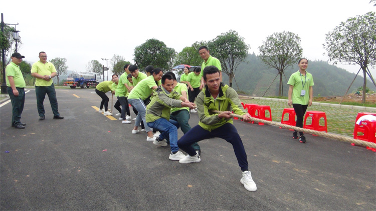 烧烤之中,游戏环节也开始了。首先拉开帷幕的是“五人六足”赛跑,两支队伍肩并肩,带燃了全场气氛。最有挑战的是友谊拔河比赛,参赛队伍有温泉部与工程部组合的暖阳队,由客房部与餐饮部组合的阳光队,酒店工程部的老男孩队,由行政人事部、保安部、采购部、IT部、财务部以及前厅部组合的热情队。比赛开始,首先是暖阳队挑战阳光队,两支队共22人分别整齐的站在场地两端,简单的交流,做着准备。随着裁判的一声令下,比赛一触即发,双方队员努力拼搏,统一的口号声“一二三、一二三”响彻西溪森林温泉的天空。无论是场上还是场下,气氛都异常紧张。尤其是在胜负难分的时刻,队员毫不退却,咬紧牙关,他们也正是本着拼搏不认输的精神完成比赛。每位参赛队员、每个员工都积极融入其中。友谊第一,比赛第二。最后获得胜利的队伍是温泉部与工程部组合的暖阳队,行政人事部给暖阳队全体人员分发了奖品西溪公仔。之后的“背对背运气球”比赛、“蒙眼吃西瓜”比赛又将气氛推向了高潮。