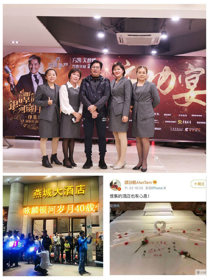 发布日期:2019年11月23日谭咏麟40年巡回演唱会-怀集站,燕城大酒店凭借优越的地理位置、完善的设施设备、严密的安保措施及优质的服务,而且以往接待过众多名流贵宾、商界精英、明星团队等,被主办方指定为谭咏麟演唱团队接待酒店,当听到这个好消息,酒店所有员工都非常激动及期待。为了迎接谭咏麟演唱团队的到来,酒店对员工进行重温“服务礼仪、礼节”、“标准服务用语、动作”及“员工应知应会”的培训,提高员工对客服务质量,“现场应急处理能力”专业知识的考核,并呼吁员工利用微信平台,提前做好谭校长演唱会下榻燕城酒店的各项宣传工作,以作明星宣传效应,提高酒店知名度。