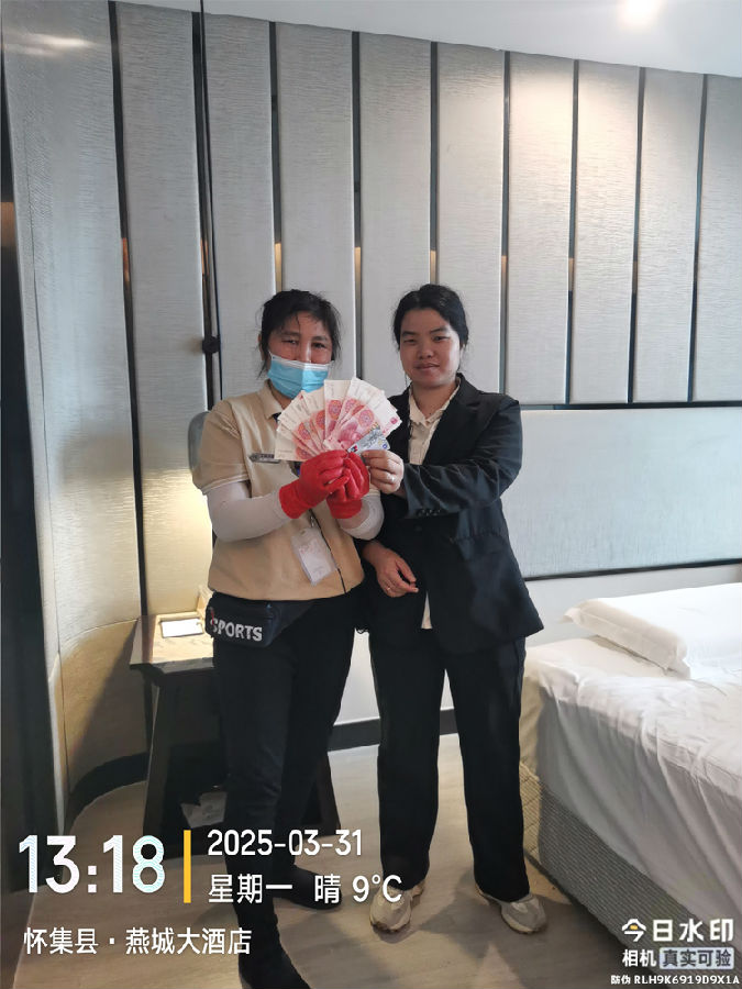 发布日期:2025年03月31日2025年3月31日13时10分,燕城大酒店楼层服务员邓亮在清扫605B客房时,意外发现客人遗留的现金及银行卡。面对800元现金与一张中国建设银行储蓄卡,她第一时间通过对讲机将情况上报至前台及当班领班。