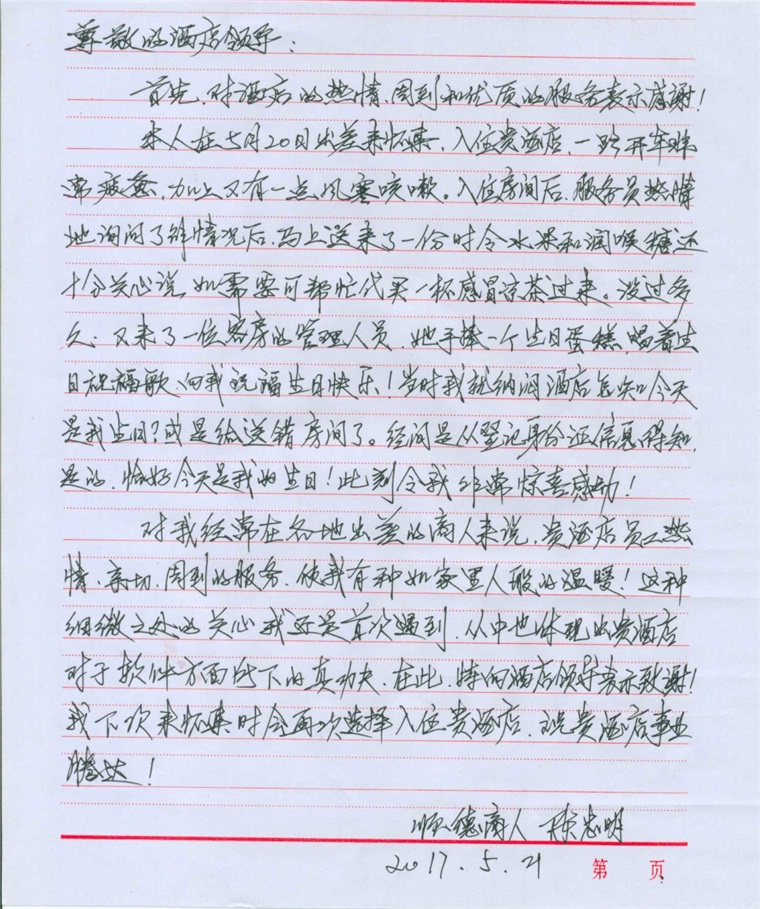 2017年05月21日在酒店服务中处处是细节,从客人入店到离店,先客人之所先,忧客人之所忧,一个意想不到的小细节,给予客人的可能就是一个大惊喜。5月中旬,酒店了解到一位客人入住期间...