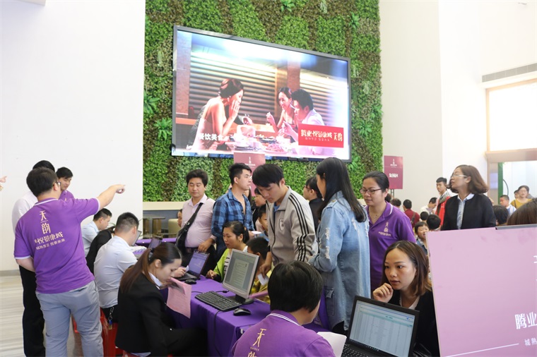 为了贴近悦景康城五、六期天韵组团的项目形象要求,在公司领导的指导及各部门的极力配合下,销售中心完成了历时一个半月的升级改造,蜕变为天韵销售中心,并顺利于4月29日面向公众开放。中心内部装修充分表现了天韵组团的时尚品格,其中最为体现天韵组团特色的是“悦生活品鉴中心”。品鉴中心主要由项目总体介绍、项目舒心智能生活介绍、项目人文生活展示三大部分组成,通过篇章的模式,把客户引领进悦生活新概念社区当中。第一部分项目总体介绍,分别展示了腾业品牌发展历程、城东城区规划及悦景康城5分钟生活圈、腾业户型变迁及天韵组团日照通风模拟,让客户对腾业集团及其项目的发展有更深入的了解;第二部分项目舒心智能生活介绍,分别介绍了智能车牌识别系统、人车分流、有氧慢跑径、物业1.8.2.7快速反应服务体系、八级安全防护系统、智能快递收取机及多样便民服务等,让客户亲临现场即可体验悦舒心的健康智能生活感受;第三部分为项目人文生活展示,让客户感受悦景康城小区的文化生活及社区人文关怀,感受到居于此区的业主不仅拥有优质的居住环境,还有丰富上层的精神文化需求。