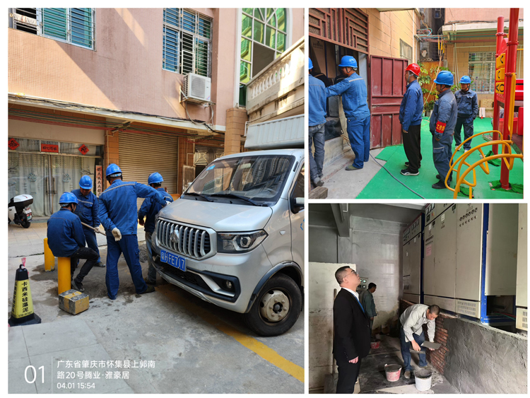 雅豪居小区电房设备因常年受特大洪水侵袭,电屏、电机等核心设施严重受损,停电、电压不稳等问题频发,居民日常生活备受困扰。为根治这一“顽疾”,2024年,恒基物业联合小区业主代表,积极向怀集县人大、南方电网(怀集供电局)、怀城街道办及上郭社区等部门反映问题,迅速引起高度重视。县人大指派专人全程督办,南方电网(怀集供电局)牵头协调,广东电网总公司更将其列为重点支持项目,高效完成立项、设计、勘探等前期工作,为工程推进按下“加速键”。