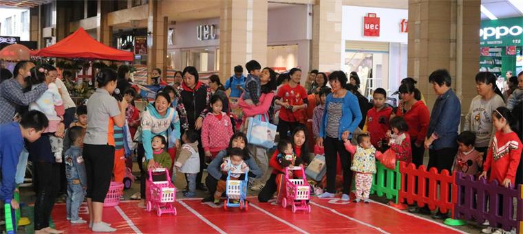 早上天气骤变小雨伴着风,但是一点都没有磨灭家长和小朋友的激情,她们早早地来到活动现场等候着。早上10时,亲子活动拉开了帷幕。比赛前工作人员帮小孩子贴上数字标签,家长和孩子来到游戏赛道上,在主持人介绍完比赛规则后,随着一声哨声,开展各种游戏活动。第一个游戏我是小小采购员;孩子一出发,妈妈就指引自己的孩子推着购物车到中折点将相应的物品放到购物车里,孩子手忙脚乱,妈妈心里着急,惹得现场观众们笑声连连。接着到第二个游戏伦敦桥,妈妈和孩子面对面,手拉手在半空形成半圆桥形,两人一组从半圆桥形穿插而过,这个游戏拉近的家长与孩子的互动。大家都积极的投入到各项游戏中,玩的不亦乐乎,并拿到了相应的奖品和礼品。家长和孩子都乐此不彼,整个街区的都回荡着大家的嬉笑声,喜悦之情感染到现场的每一位顾客,纷纷前来围观。