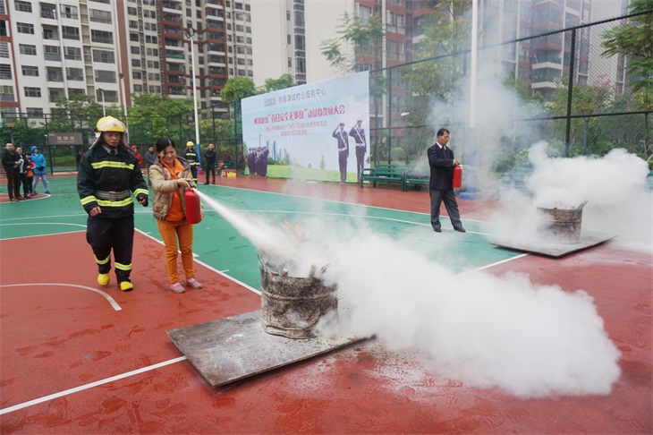 在启动大会上还进行了消防演练,如:现场初期火灾控制、扑救、火场协调指挥、物资转移演练等。现场还设置了小环节,就是让业主和商家亲身体验灭火器的使用。