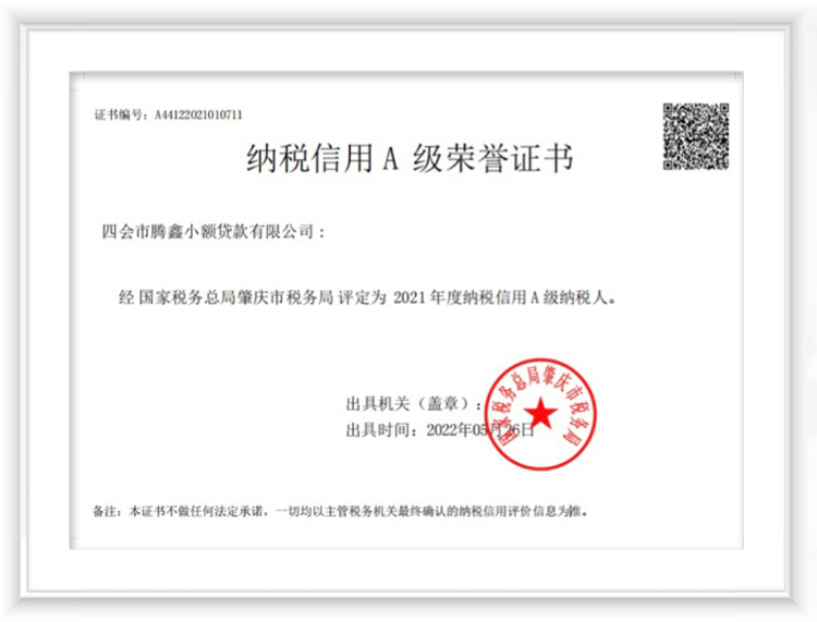 四会腾鑫小贷公司 获评为2021年度纳税信用A级纳税单位