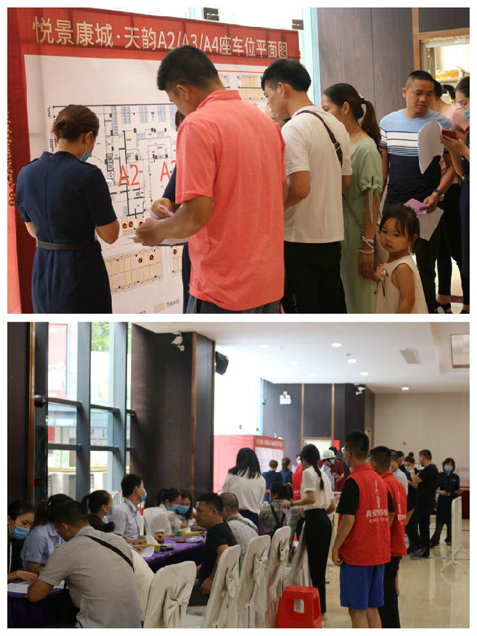 2020年8月16日,腾业·悦景康城·天韵丨第二批车位预选车位登记,盛大开启!当日,现场人气爆棚,众多业主纷至沓来,有些甚至还未到签到时间,就提前做足准备,守在预选车位的现场,以给爱车抢个好位子!既保证全家人的出行方便,又是对爱车的一种有效保护。工作人员贴心地提前准备好了各式冷餐茶点方便各位家人随时品尝。在场业主不断查看车位分布图、咨询置业顾问,了解抢“位”流程。销售工作人员也热情的为每一位业主介绍活动的流程,解答活动流程中的疑问,为每一个向往美好生活的业主提供帮助!物业工作人员细心守卫着现场的秩序,为每一位业主能顺利认购自己心意的车位提供一个和谐的有序的认购现场。