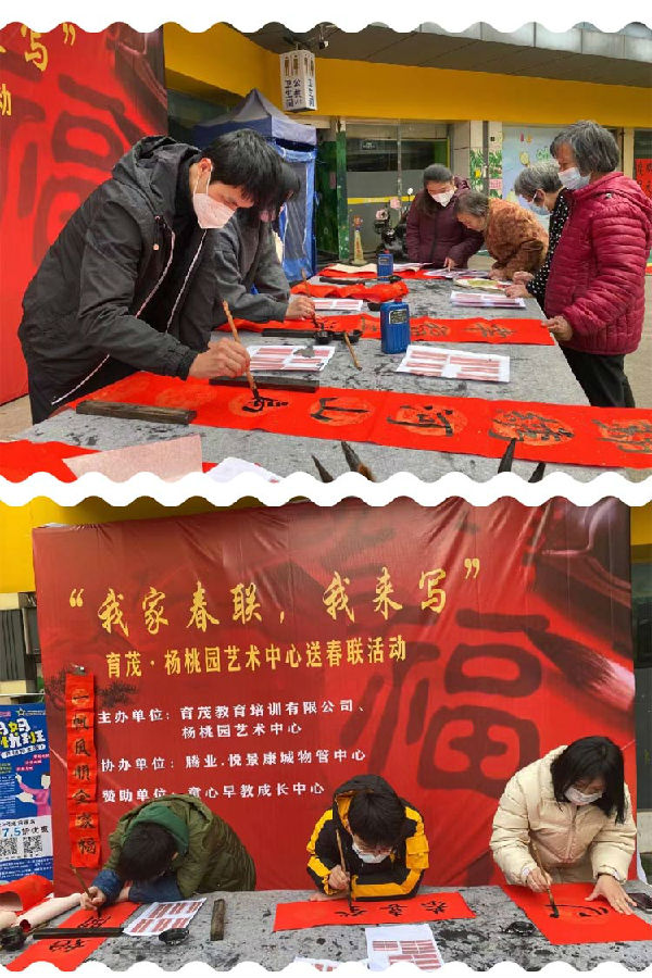 发布日期:2023年01月03日春节临近,年味越来越浓,为进一步营造浓厚的新年氛围,弘扬中华民族优秀传统文化,喜迎兔年新春,2023年1月1日-3日育茂教育·杨桃园艺术中心联动悦景康城物业服务中心在悦景康城内街开展了“我家春联·我来写”迎新春送春联活动,把浓浓的年味儿和新春的祝福,送至广大群众心里。