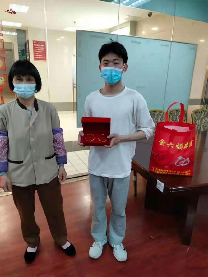 2021年2月23日,悦家百货商场的清洁员阿姨邓妹凤像往常一样进行清洁作业时,在步行街二楼太阳岛儿童乐园休闲椅上面捡到一个标有“金六福珠宝”的红色袋子,里面装有一对黄金龙凤手镯,想到必定是失主在商场的金六福珠宝店购买的。由于没有联系方式,对于找到失主有了一定的困难,在原地等待无果后,考虑到失主肯定非常着急,立即将袋子交到悦家百货管理处妥善保管。