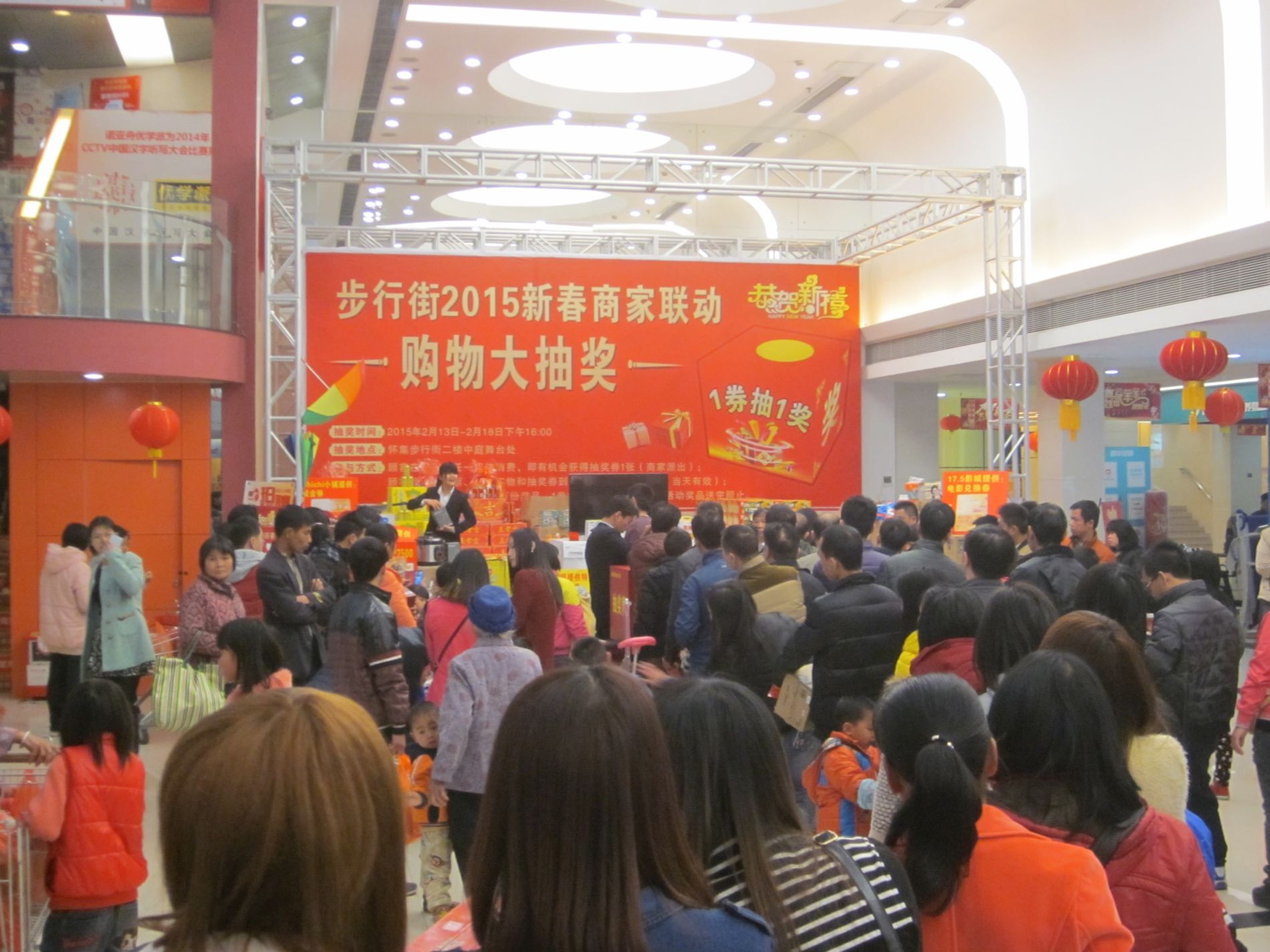 春节前,活动主要以“步行街商业升级惠民庆新春”为主题开展抽奖活动。我们联动了步行街所有商家巨资购置约1.1万个奖品,奖品主要是日常生活用品,如名贵钻戒珠宝、电视机、洗衣机、电脑、手机、电磁炉、电压力煲、衣服皮具、洗浴用品、米油酱醋、茶壶杯子、餐券金券等。目的是带动商业步行街的人流量,让怀集的老百姓在购置年货时可以参加抽奖,免费获取实用的商品欢度春节 。