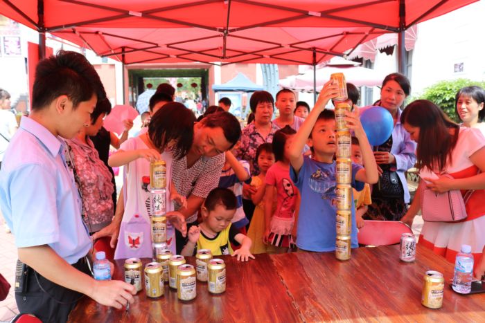 活动内容丰富多采,有圈金鱼、吹蜡烛、叠易拉罐、吹乒乓球、扔飞镖、夹玻璃珠等6个游戏项目,分别设在C、D区不同的地点举行。当天一大早,太阳公公早早起身普照大地,但炎炎夏日却抵挡不住小朋友的热情,他们一大早便纷纷前来排队等待活动开始。上午10点,活动准时开始,在家长的陪同下,小朋友们兴高采烈地穿梭在各个游戏间,尽力去赢取印花票。其中最有趣的是“叠易拉罐”游戏,游戏规则是在不倒的情况下把易拉罐叠得最高就可以得奖,平时难得一静的小朋友,却在面对这个游戏的时候,一改常态都安静了下来,静静地、耐心地叠起了那似乎毫无重力的易拉罐,小心地护着它们,生怕一丝风把自己的“高楼大厦”给吹垮了。一次一次的倒下,重来,丝毫没有击垮小朋友必胜的决心和意志,最终获胜的是凭借聪明与智慧把易拉罐叠到7个高的小男生,赢得了这个游戏的印花票。台面上7个高的易拉罐,可是比那个小男生高出一个头呢!