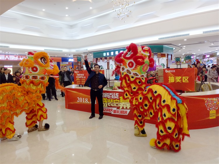 当天,腾业集团资产管理中心总经理梁铭枝先生、执行总监彭灿强先生,1支醒狮团队、15个卡通人偶等人齐聚在步行街一楼正门,伴随着锣鼓和礼炮声响起,两只狮子翻腾舞动,身形矫健敏捷,来到步行街二楼悦家百货中庭位置,演绎了一场精彩绝伦的采青表演。其中将操青、惊青、食青、吐青等环节表演得异常精彩,围观群众的掌声、喝彩声不断,开启了悦家百货开业活动的序幕。随后,两只狮子齐齐去到悦家百货各商铺采青,恭贺各商家开张大吉,生意兴隆,此时此刻,全场渲染了一层浓浓的喜庆气氛。